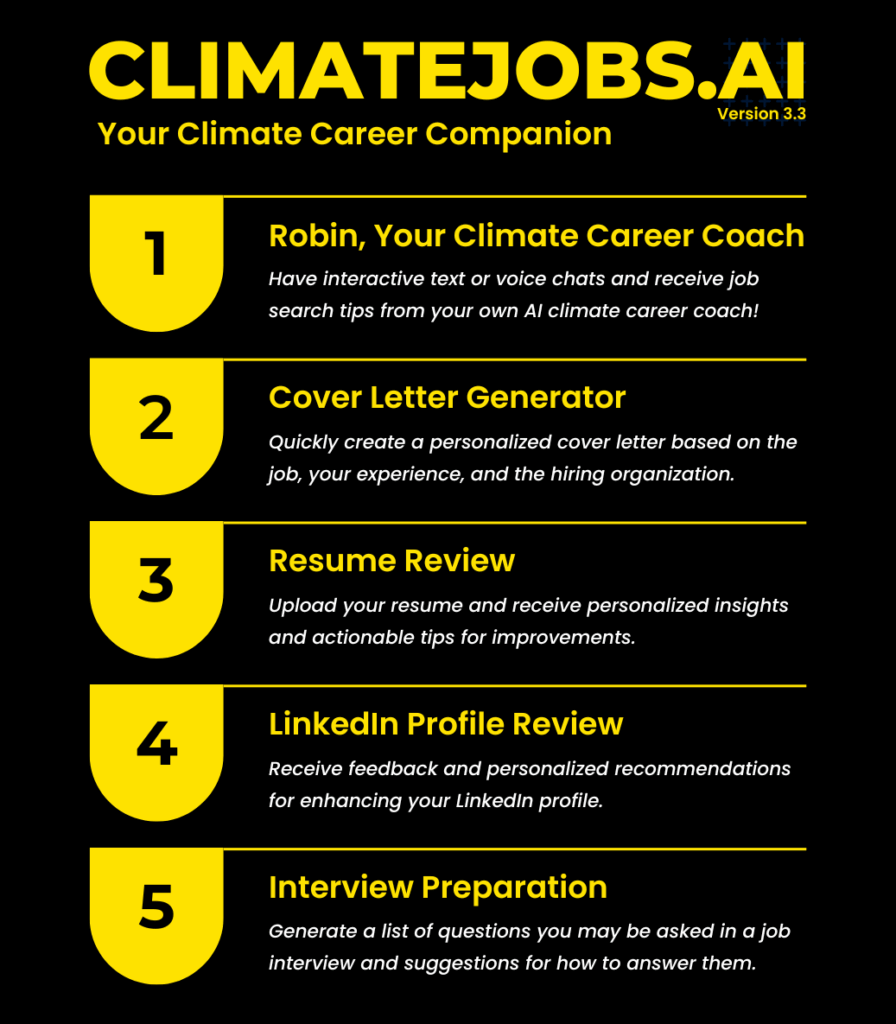 You can also access AI-powered climate career services via ClimateJobsGPT, which is available for free in the OpenAI GPT Store. ClimateJobsGPT also includes access to Robin, our AI climate career coach, you can upload your resume for feedback, and much more!